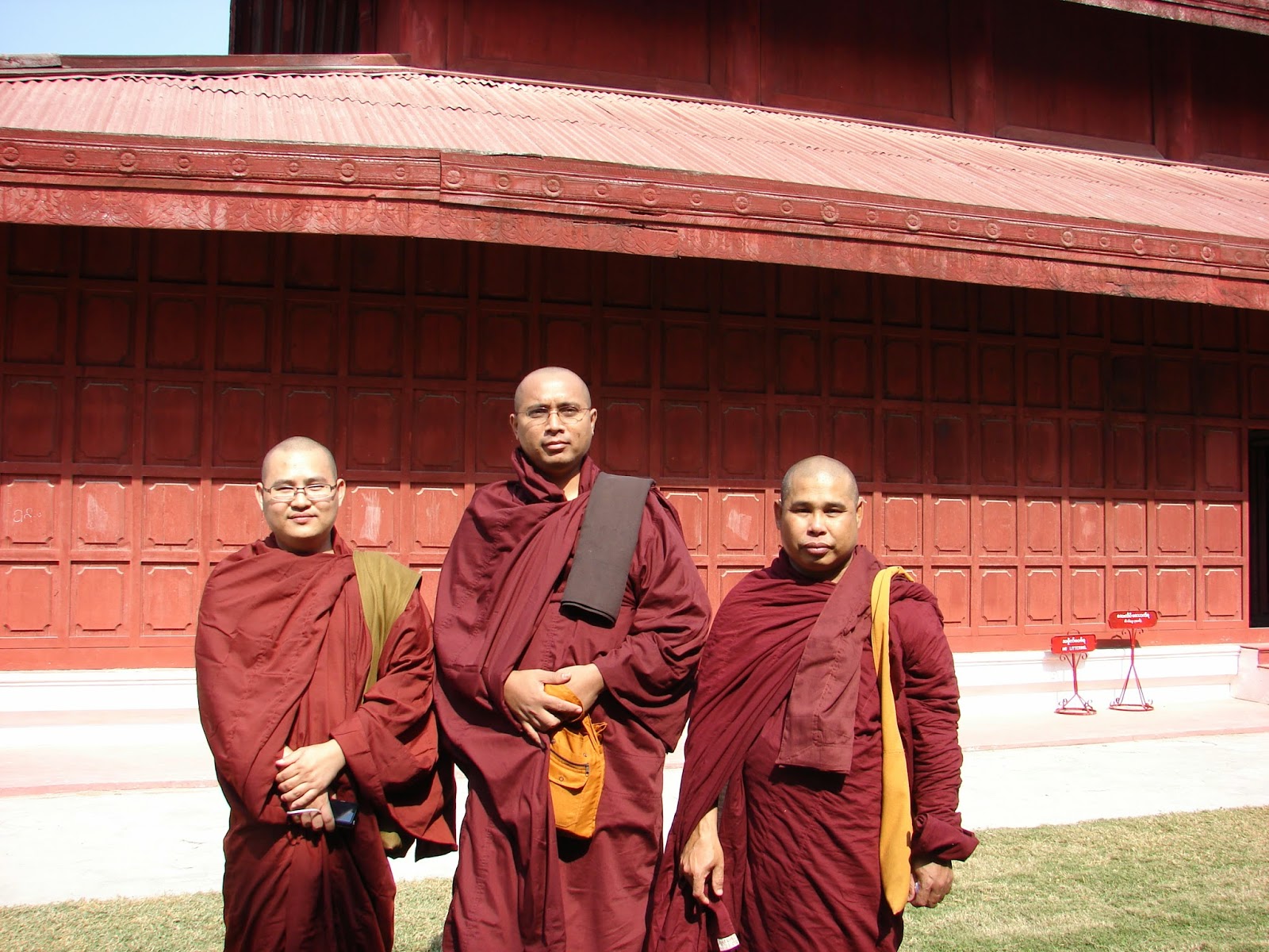 where a steamship took them to exile in India. The British turned the area into a fort and much of the palace was destroyed in allied bombing during WW II. The palace was rebuilt in the 1990s. Even so it was still interesting with many of the signs written in English. One of the interesting aspects of travel in this part of the world is that we sometimes become the attraction (let’s face it we look different) so sometimes people want to take our picture. Such was the case with some Buddhists monks at the palace. We reciprocated by taking pictures of them.